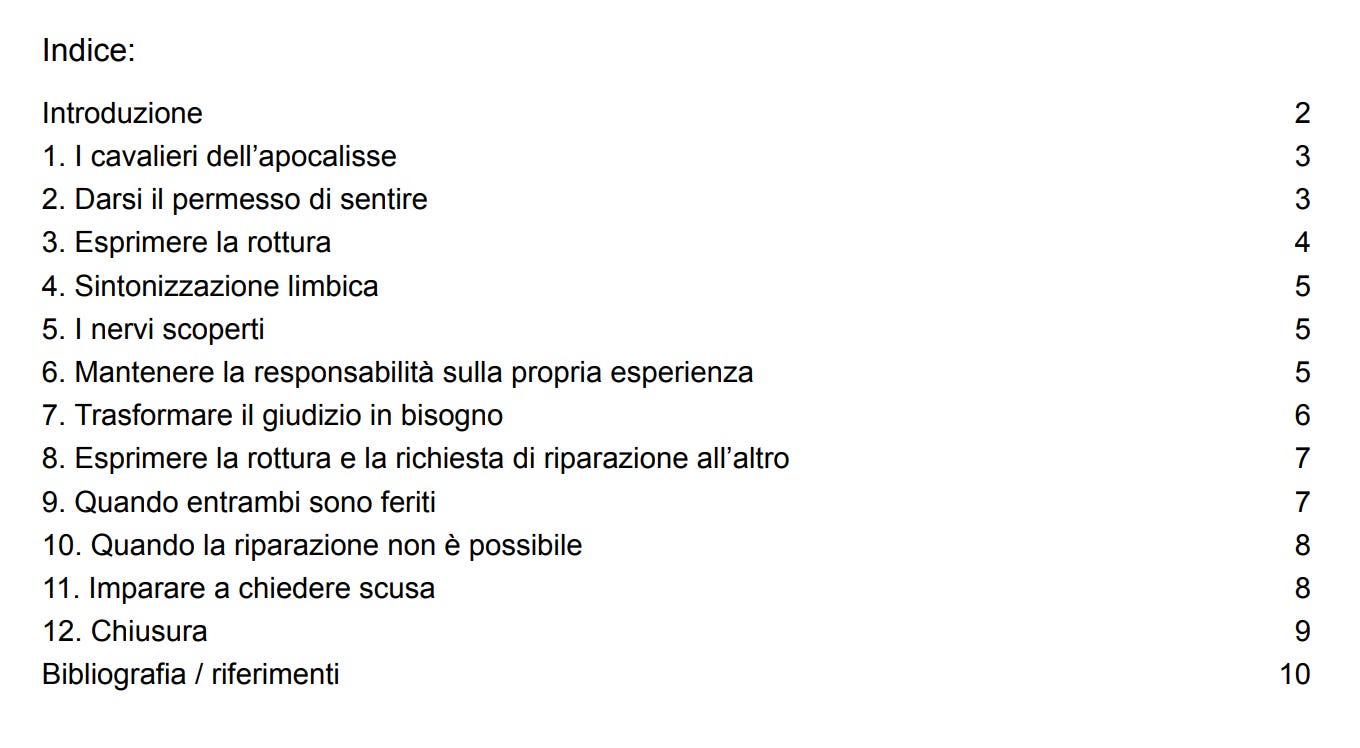 Questa guida raccoglie alcuni dei passaggi che considero più utili per farlo: darsi il permesso di prendere sul serio ciò che si sente, al di là del giusto e dello sbagliato; usare le emozioni intense del conflitto come informazioni; passare dalla reattività alla radice dei bisogni emotivi; comunicare mantenendo la responsabilità della propria esperienza; capire quando una riparazione è possibile e quando non lo è; imparare a chiedere scusa senza scivolare nel senso di colpa.